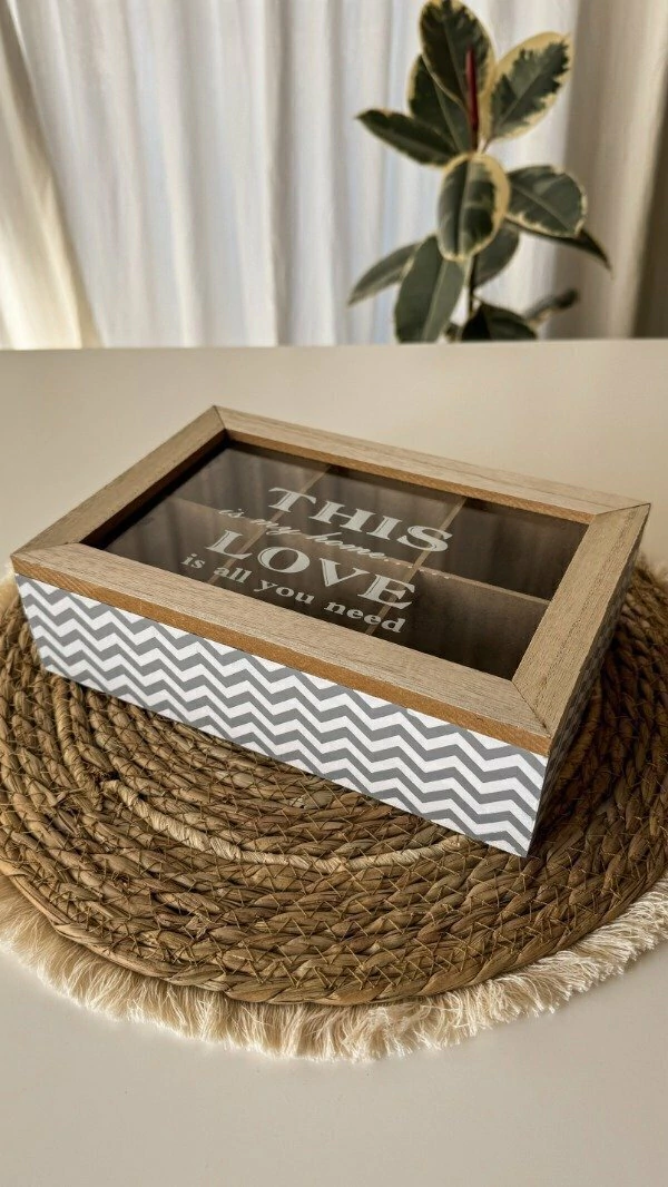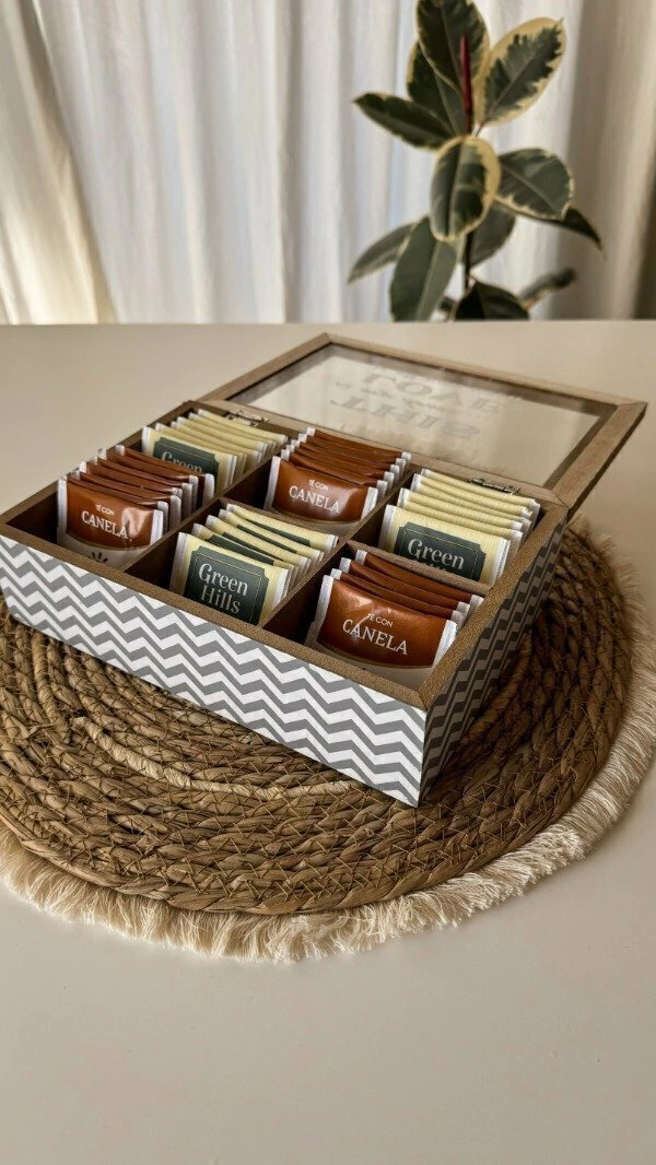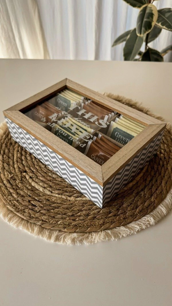 Organizá tus saquitos de té con estilo. Esta caja con tapa de vidrio y frase decorativa es perfecta para tener tus sabores favoritos siempre a mano.