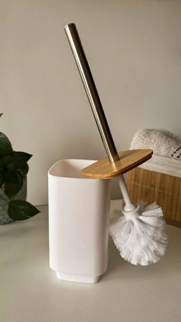 Diseño minimal con base blanca mate, tapa de bambú y mango metálico. Perfecta para sumar estilo en los detalles del baño.