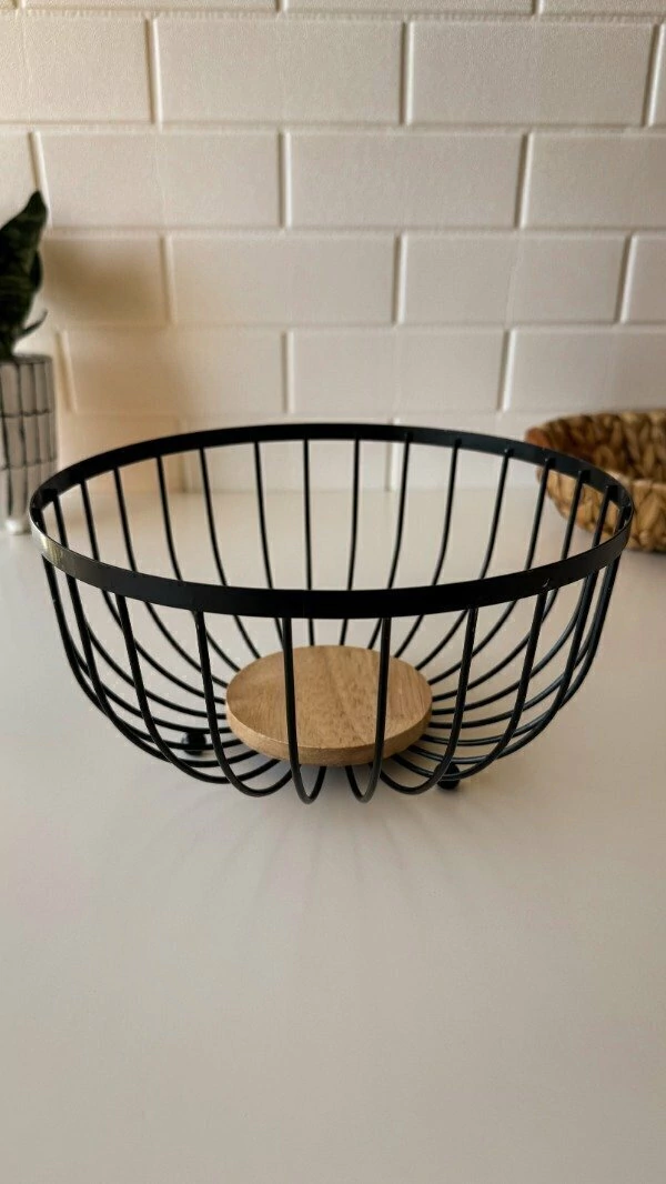 Un diseño moderno y funcional para tu fruta. Este bowl combina un estilo industrial con una base de madera, añadiendo practicidad a tu cocina o comedor.