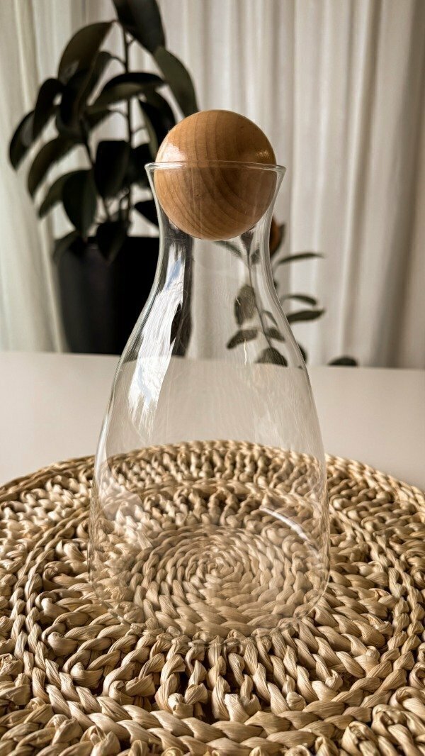 Una opción práctica y elegante para tus bebidas. Esta jarra de vidrio con tapón mantiene tus líquidos frescos y protegidos, ideal para servir en cualquier ocasión.