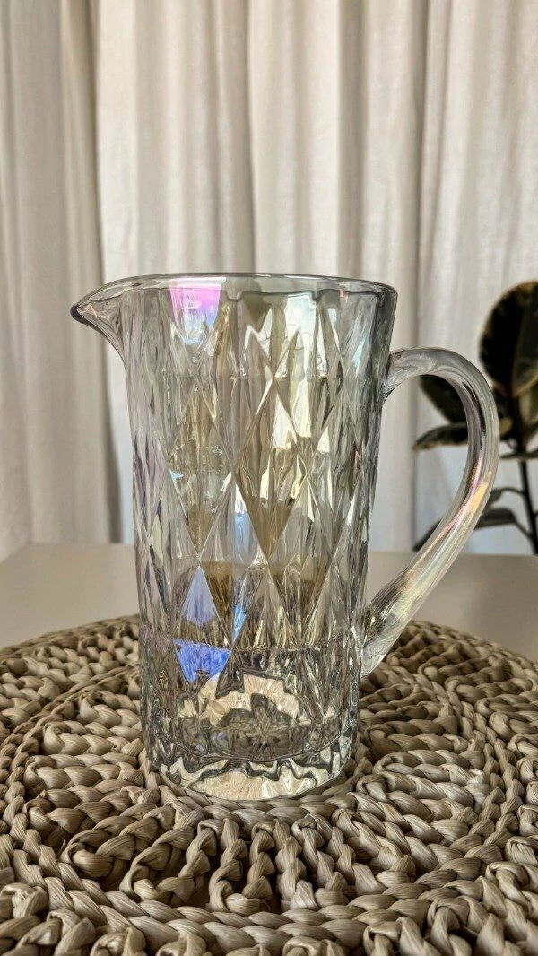 Con acabado tipo diamante y reflejos tornasolados, esta jarra eleva cualquier mesa. Ideal para agua, jugos o tragos, combina diseño elegante y funcionalidad.